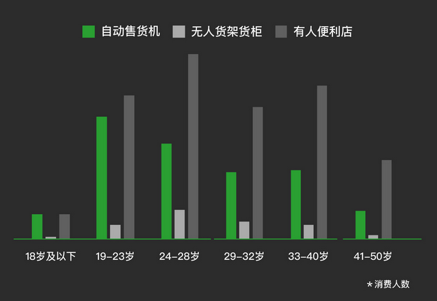 相較于傳統(tǒng)零售店,用戶群體的年齡分布差異更加顯著,偏向傳統(tǒng)便利店的普遍在30-40歲之間。自動售貨機的消費主力群體年齡段主要集中在 95后,未來購買力的主力軍,而且在30歲左右年齡段消費群體中也有一定的比重。